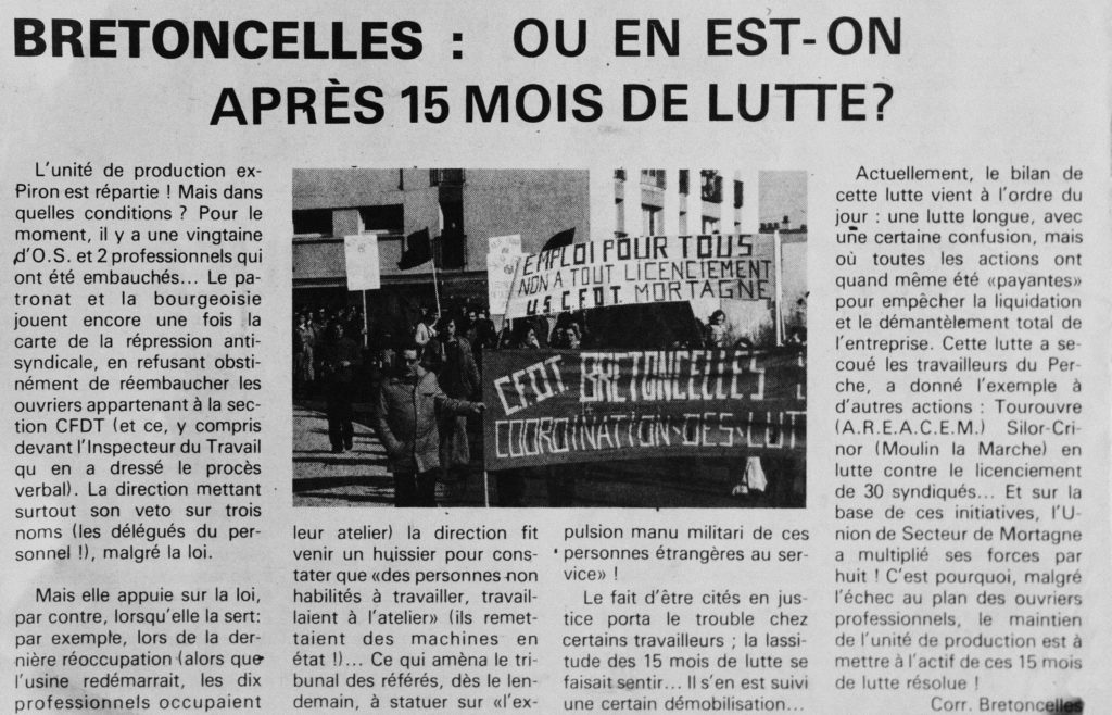 À Bretoncelles, en décembre 1974, les ouvrières et ouvriers de l’équipementier Piron, confrontés à une menace de fermeture, se mettent en grève, occupent l’usine et licencient leur patron.